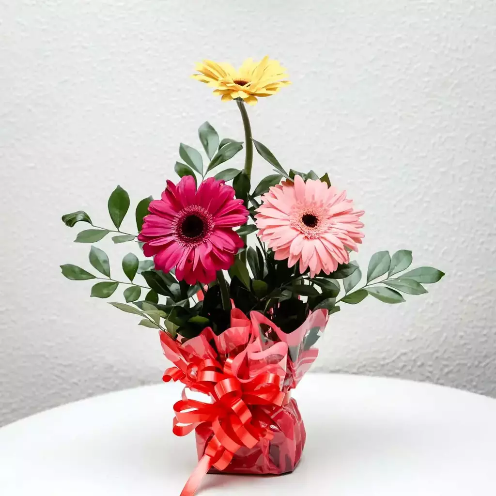 Lindo buquê com 8 Gérberas, a Gérbera é uma flor nobre de cor forte encantadora! Delicadamente preparado.